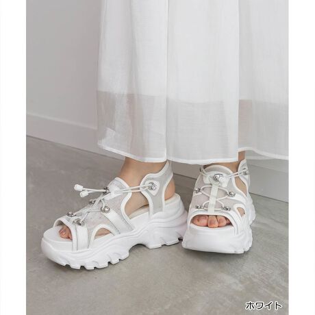 スポーティーなボリュームソールサンダルにビジューパーツやストーンを施し、程よくフェミニンな印象に仕上げました。