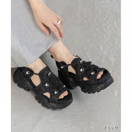 スポーティーなボリュームソールサンダルにビジューパーツやストーンを施し、程よくフェミニンな印象に仕上げました。