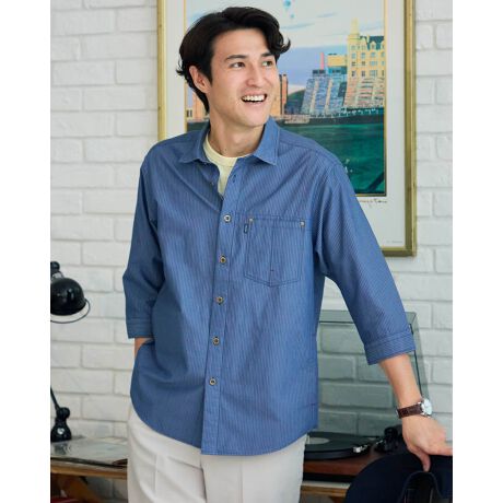 [型番:314R4210]七分袖丈のシャツ羽織りです。同系色のストライプサッカー生地を使用しています。凹凸感があり、さらっとした着心地が特徴です。前身頃の豊富なポケットも実用的で魅力です。