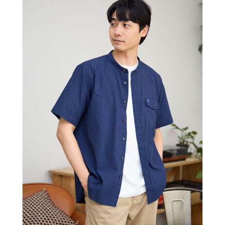 軽く羽織れるバンドカラーシャツです。ドビー組織を入れ表情のある生地に仕上げました。胸のフラップポケットがアクセントです。