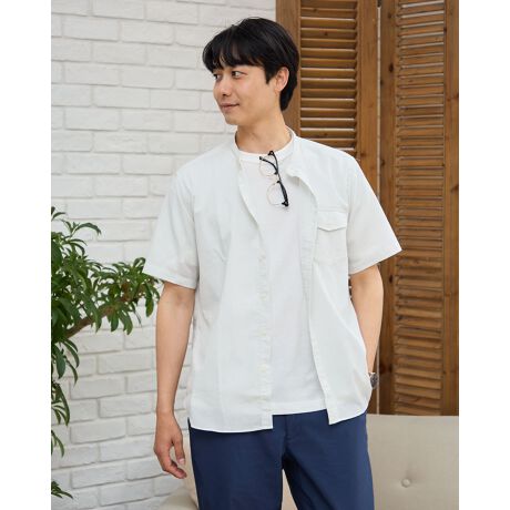 軽く羽織れるバンドカラーシャツです。ドビー組織を入れ表情のある生地に仕上げました。胸のフラップポケットがアクセントです。
