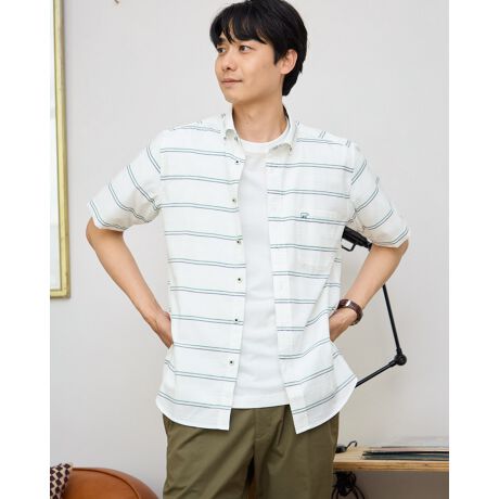ボタンダウン襟のボーダー半袖シャツです。部分的にドビー組織を入れ表情のある生地に仕上げました。白場のボーダーは清潔感あり、爽やかな印象を演出してくれます。