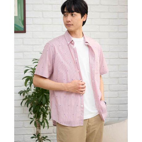 ボタンダウン襟のストライプ半袖シャツです。ストライプ生地に小柄プリントを施しました。細ストライプはどのインナーにも合わせやすいのが特徴です。デニムと合わせたコーディネートがオススメです。