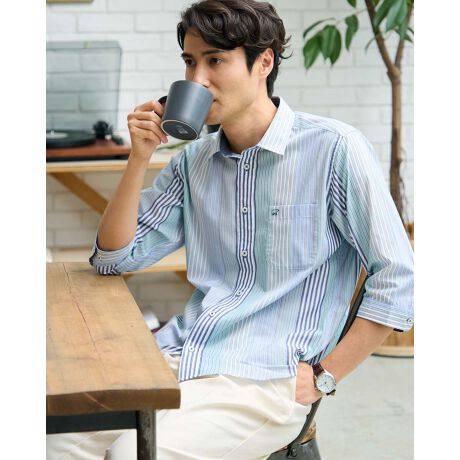 七分袖のレギュラー襟ストライプシャツです。キレイな多色のマルチストライプに仕上げました。軽い羽織りアイテムとして長い期間でお楽しみいただけます。夏の紫外線対策としても活躍してくれます。