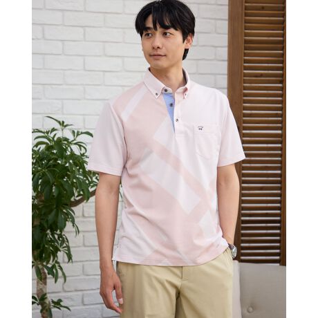 上品なボタンダウン襟ポロシャツです。吸水速乾性に優れた鹿の子生地を使用しています。さらっとした着心地が特徴です。前身頃に無地柄のプリントを施しました。ジャケットのインナーから、カジュアルスタイルまで幅広いスタイリングをお楽しみください。