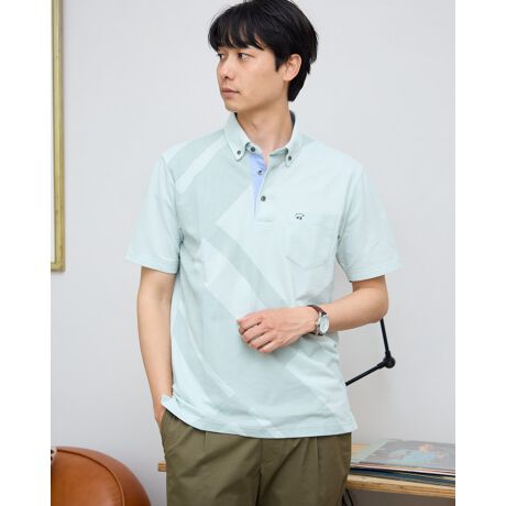 上品なボタンダウン襟ポロシャツです。吸水速乾性に優れた鹿の子生地を使用しています。さらっとした着心地が特徴です。前身頃に無地柄のプリントを施しました。ジャケットのインナーから、カジュアルスタイルまで幅広いスタイリングをお楽しみください。