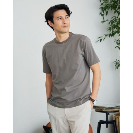 ひんやりとした肌触りの涼しいTシャツです。接触冷感性に優れたスムース編地を使用しています。滑らかな肌ざわりで上品に仕上げました。後ろ襟を高く設計することで、ジャケットの襟裏汚れを防ぎます。ジャケットとの着合わせに最適なTシャツです。