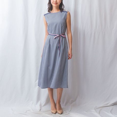 [型番:32-51-54-590]幾何柄×ボーダーMIXのスカーフ風プリントで仕立てられたワンピース。肩の部分のボーダー使いとゴールド釦でマリン風なイメージに。ボーダーと同柄の細リボンが付属しており、ウエストマークすることで愛らしくメリハリ感をプラスしてくれます。軽くて柔らかなストレッチ素材を使用しており着心地が良いのも魅力。1枚でも着こなしが決まり、ジャケットと合わせたコーディネートもおすすめです。・カラー展開はピンク、ブルー・サイズ展開は1(M)9号・3(2L)13号