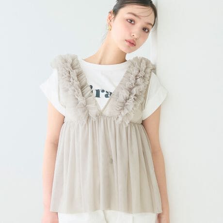 主役級アイテム!立体的なフリルが目を惹くチュールVネックトップス