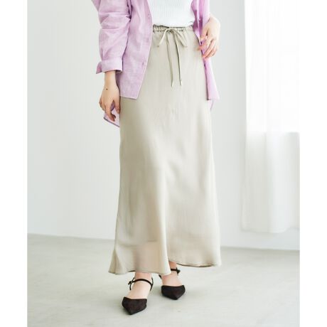 [型番:3053046000]人気のスカートが復活!微光沢のとろみ素材が魅力のナロースカート。裾へ向かうドレープ感も美しい、シルエットにこだわったスカートです。●ポイントウエストはオールゴムでイージーな履き心地。ウエストをひと折りすることで低身長の方にも着用頂けます。●おすすめコーデ シーズンレスなスカートは春夏はシャツやざっくりニットでさらっと着こなし、秋冬はニット×シャツのレイヤードスタイルや、ジャケットと合わせたトラッドな雰囲気もおすすめです。