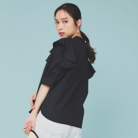 ・ハイネックと立体的なフリルが特徴の6分袖ブラウス。