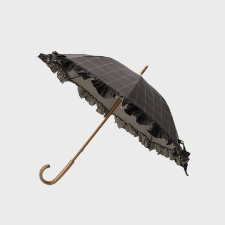 大人フリル使いとチェック柄で持ち手もウッド使いの為、上品感があり、人目をひきつけるような存在感のあるラグジュアリーな日傘です。