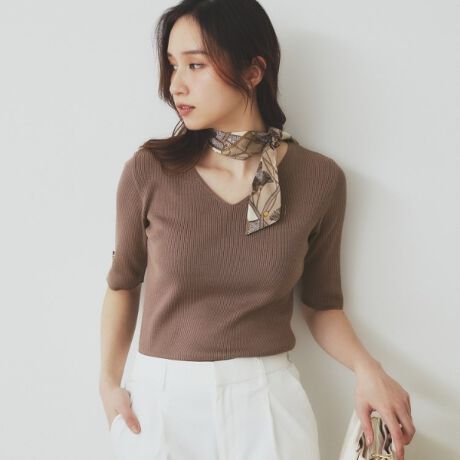 ・リブ編みが程良くフィットし、すっきりしたシルエットがスタイルを美しく見せ、五分袖のデザインが着心地良く軽快さを演出します。