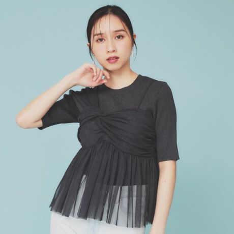 ・チュールキャミとラメリブニットのセットアイテムなので、レイヤードスタイルを楽しめるだけでなく、それぞれ単品でもお使いいただけます。