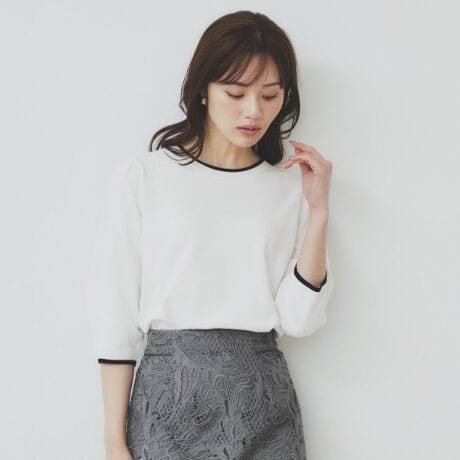 ・アイレットが効いたクルーネックは、すっきりとした印象を与え、顔周りを華やかに演出します。