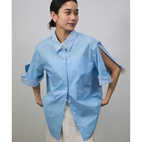 衿と袖口の重ねたレースが繊細で美しいデザインのシャツ。