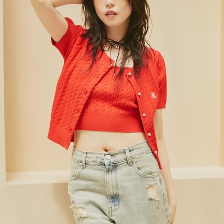 丸ボタンやブランドロゴ刺繍が目を引くワンポイント。