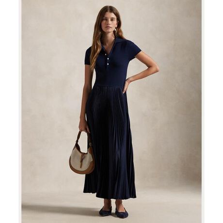 フィット感のあるPoloセーターのトップス部分と、流れるようなサンバーストプリーツのシャルムーズスカートを組み合わせたドレス。トップス部分の平編み襟とボタン付きのハーフプラケットが特徴的・フィット & フレアのシルエット / くるぶしよりやや上の着丈・ポロカラー / 5つボタンの前立て・半袖、リブニットのカフス / セーターのトップス部分・サンバーストプリーツ スカート / 裏地なし・モデル身長178cm、着用サイズS※商品の色味は、光のあたり具合など諸条件により色感が多少異なって見える場合がございますので予めご了承下さい。 【素材】・本体上部分:レーヨン 58%、ナイロン 40%、ポリウレタン 2% 本体下部分:ポリエステル 100%【生産国】中国