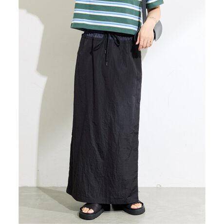 さりげなくウエスト部分が配色になったモードな印象のタイトスカート。微光沢のナイロン素材で、きれいめにもカジュアルにもフィットします。肌寒い時期にはスウェットやニッなどと合わせてバランスをとったりこれからの季節にはTシャツやタンクトップでミニマルにこなして頂くのもおすすめです。