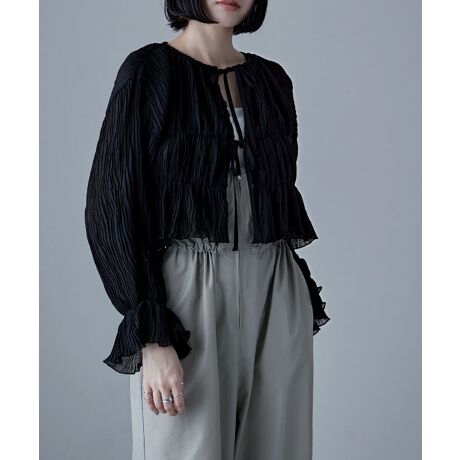 シャーリングとベルスリーブの甘さとモード感が目にとまる、前後2wayで着用可能なリボンカーデ。