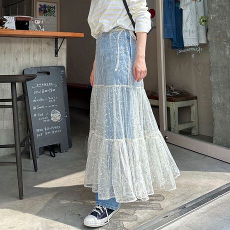 シアーなチュール素材の生地にスパンコール刺繍をほどこした、ロマンティックなロングスカート。