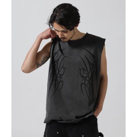オリジナルグラフィックが前後にプリントされたノースリーブカットソー。