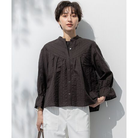 肩まわりはすっきりとコンパクトな作りで、胸元の切り替え下からはギャザーを入れているので、身体のラインを拾わず、切り替え下からはギャザーフレアになっているので張り付かず、涼しげな印象でご着用いただけます。前の釦を閉じていても開けてもサマになる1枚です。カジュアルにもきれいめにも着回せるので、さまざまなシーンで活躍してくれます。カラーはシックなブラック(#005)、爽やかで清涼感のあるホワイト(#001)、目を惹くオレンジ(#020)の3色展開です。