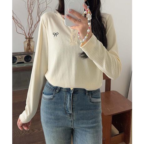 ヘンリーネックのデザインに小さなリボン刺繍が施された、シンプルでありながら可愛らしい印象の長袖Tシャツ。柔らかなリブ編みの素材で着心地がよく、シンプルでありながらもアクセントとなるディテールが魅力です。カジュアルでありながら、女性らしさを引き立てるアイテム。