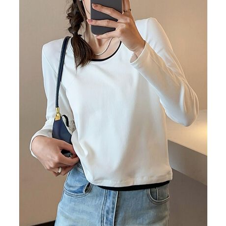シンプルで上品な配色ネックデザインが特徴の長袖トップス。首元の配色がさりげないアクセントとなり、どんなコーデにも合わせやすい万能アイテム。程よいフィット感とリブ編みが女性らしいシルエットを引き立てます。カジュアルからきれいめスタイルまで、幅広いシーンで活躍する一着です。