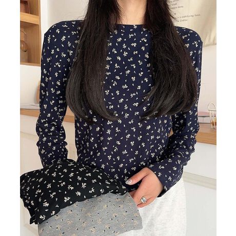 小花柄のプリントが特徴的なシンプルな長袖Tシャツ。日常的に着回しやすく、カジュアルでもあり、どんなコーディネートにもぴったりです。丸襟のデザインと、柔らかな生地感で、着心地も快適です。