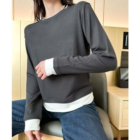 シンプルでありながら、裾部分の異素材感が魅力的な長袖トップス。重ね着風デザインで、一枚でも存在感があり、シンプルながらもおしゃれな印象を与えます。タイトすぎずリラックスした着心地。