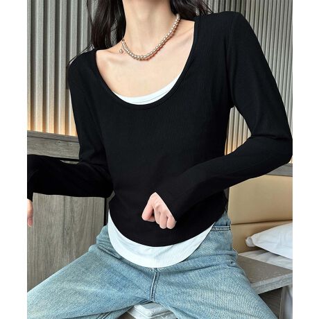 シンプルでありながらレイヤード風デザインが特徴的な長袖Tシャツ。丸みを帯びたネックラインと袖口のディテールが上品で、落ち着いたカラーリングが大人っぽさを引き立てます。シンプルなデザインでありながら、コーディネートしやすく、様々なシーンで活躍するアイテムです。