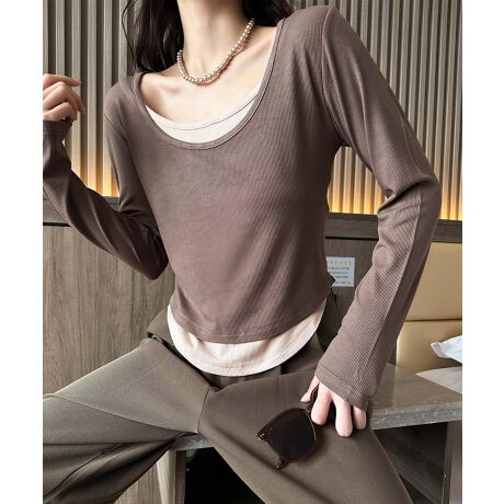 シンプルでありながらレイヤード風デザインが特徴的な長袖Tシャツ。丸みを帯びたネックラインと袖口のディテールが上品で、落ち着いたカラーリングが大人っぽさを引き立てます。シンプルなデザインでありながら、コーディネートしやすく、様々なシーンで活躍するアイテムです。