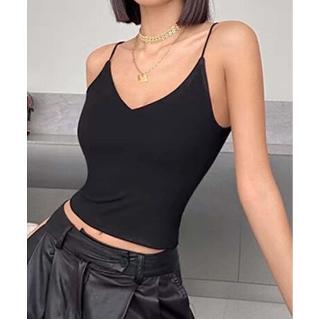 V字型なシンプルキャミソールです。フィット感があるので1枚でもインナーとしても着用できます。肩を出すことで、女性らしい印象を与えるバンドゥデザインが、トレンド感を高めます。