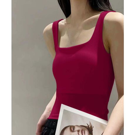 肩ひもが太めなタンクトップです。すっきりとしたシルエットで、着回しやすく、さまざまなコーディネートにぴったり。クラシックなブラック、ホワイト、深みのあるワインレッドの3色展開で、どれも使いやすいです。