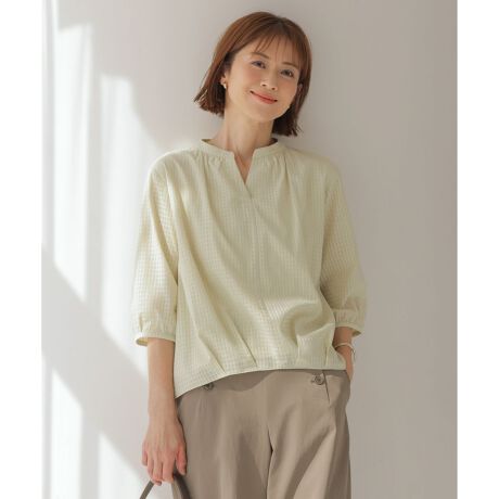 ■デザイン涼し気なバンドカラーのカットソー。前裾はタックにし、インにしているようなデザインを施し、自然ときれいなシルエットで着用できます。全て表地布帛ですが、身頃はジャージと2枚重ねにしているので、透けを気にせず着脱もしやすくなっています。袖は1枚で透け感を出し、清涼感のあるデザインに仕上げました。