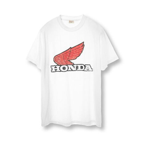 HONDAのオフィシャルロゴであるウイングマークをフロントに大胆に配置。プリントは若干のひび割れ加工を施し、ボディはウォッシュ加工仕上げで着古したヴィンテージのような風合いを演出しています。