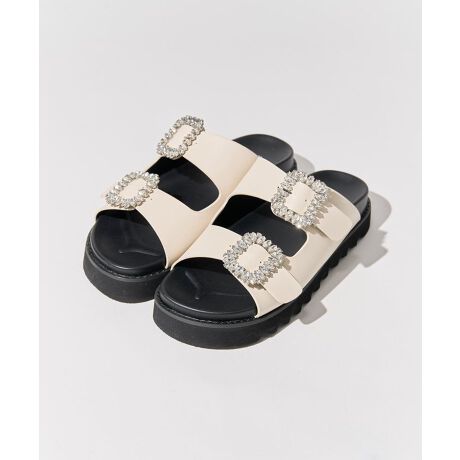 ソックスインでも楽しめるダブルベルトのフラットサンダル。キラリと華やかさをプラスする大ぶりビジューのバックルがおしゃれなポイントです。足形に沿ったアーチフォルムですっぽりと包み込み安定感も抜群。スタイルアップも叶える高めのソールでカジュアルに合わせていただけるおすすめのアイテムです。※モデル着用画像は、光の当たり具合で色味が違って見える場合がございます。※お使いのモニター環境によって商品の色味が違って見える場合がございます。