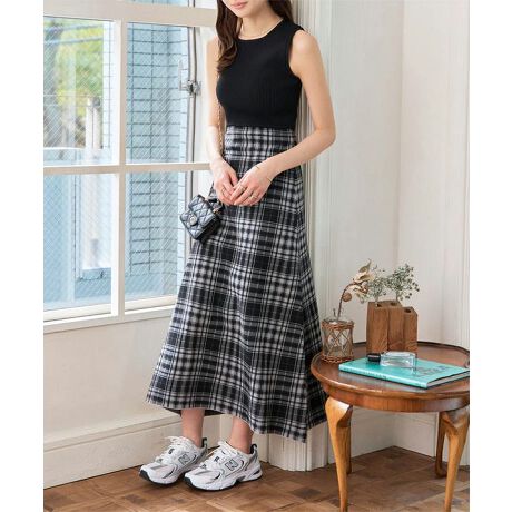 リブの編み地とチェック柄のドッキングデザインがコーデにアクセントをプラス。