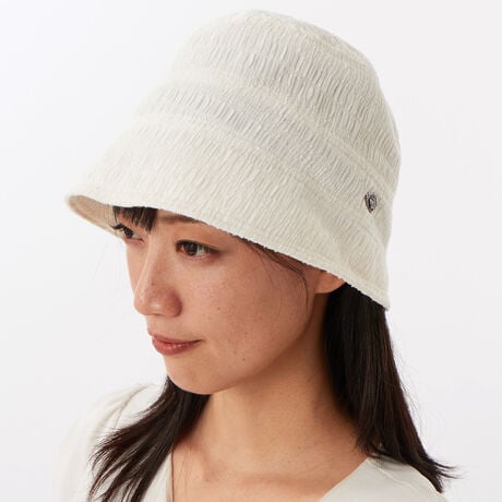 ランダムなシャーリングレースの素材が目を引くバケットハット。程よい光沢感とカジュアル感をブレンドしたアイテムなので、どんなコーディネートにも合わせやすいです。つば部分はUV加工が施され気になる日差しもケア。おでこに当たる汗止めすべりには、ファンデーションの汚れが落ちやすい抗菌・防臭素材を使用し、サイズ調整も可能です。手洗いが出来るのも嬉しいポイントです。