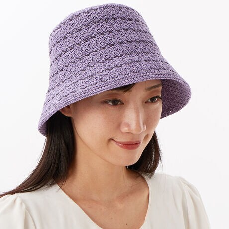 2種類の糸を組み合わせ編み立てたジグザグ編みニットクロッシェ。ベースには、軽くシャリ感のある爽やかな擬麻加工をした綿を使用している為、春・夏・秋と使用できます。きらりと光るコイル糸のジグザグ柄が主役となるアイテムです。つば部分はUVカット素材が使われていて気になる日差しもケア。手洗いが出来るのも嬉しいポイントです。サイズ調整も可能です。