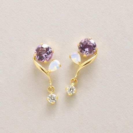 ガラスオパールの淡い色味を合わせ、春夏らしく爽やかにまとめました。ヒネリのラインが上品で、下に揺れるキュービックもさり気なく目を惹きます。