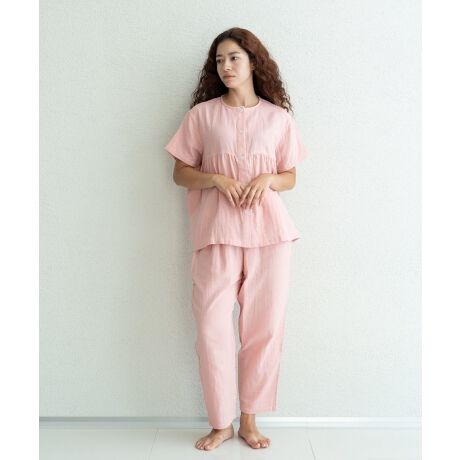 幅広い年齢の方が着用しやすい前開き仕様です。バスト下からギャザー切替の入ったデザイン。ボトムはスッキリ履けるテーパード型。