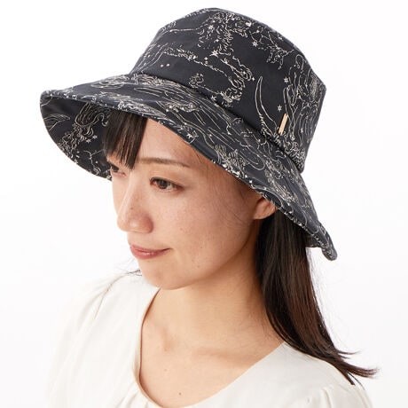 星座や星占いにフォーカスし、オリジナルで書き上げた星座柄のプリント生地を使用した中つばクロッシェ。つばの内側には一級遮光の東レ