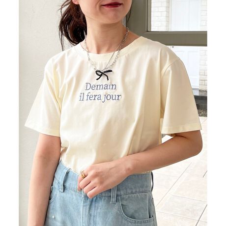 フロントのロゴ刺繍にパールをプラスした大人可愛いクロップドTシャツ