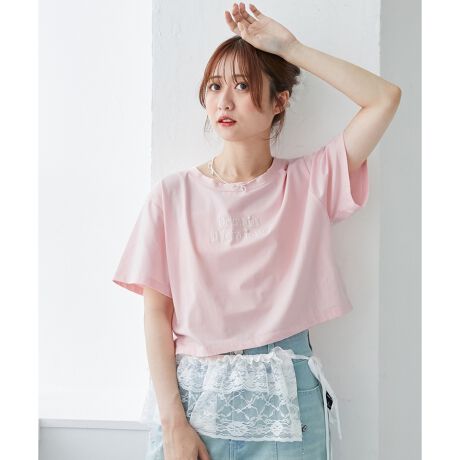 カラー刺繍ロゴにパールをプラスした、コーディネートのアクセントになるトレンドライクなクロップドTシャツ。