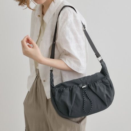 ムーン型フォルムに、ドロストデザインのポケットがデザインポイントの軽量ショルダー。