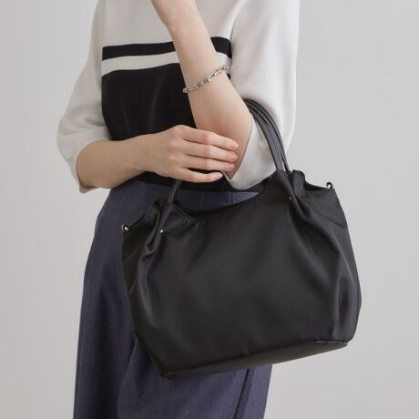 ハンドルのタックデザインと丸いシルエットが上品な撥水素材トート。