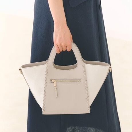 合成皮革と雑材シートの異素材切り替え、レースアップデザインのトートバッグ。