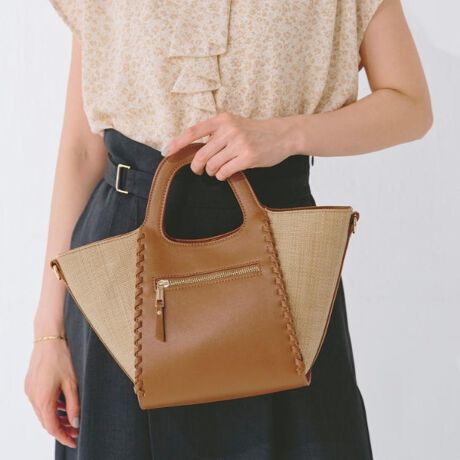 合成皮革と雑材シートの異素材切り替え、レースアップデザインのトートバッグ。
